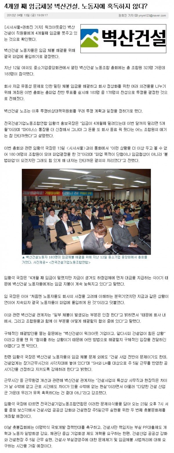 시사서울 벽산건설 파업 보도 작성자 정보 홍보부장 작성 작성일 2012.04.18 00:14 컨텐츠 정보 3,493 조회 1 댓글 목록 본문 http://www.sisaseoul.com/news/articleView.html?idxno=54745 관련자료 이전 촛불문화제 드디어 오늘입니다! 작성일 2012.04.23 13:09 다음 벽산건설 노동조합 총회 열어 파업결의! 작성일 2012.04.13 13:14 댓글 1 홍보부장님의 댓글 홍보부장 작성일 2012.04.18 00:15 부장인데 국장으로 호칭이 된 이유는. 제가 한 실수는 아니라고 주장합니다. 특별히 국장님 되고 싶은 마음 없음. 진짜루. 답글 부장인데 국장으로 호칭이 된 이유는. 제가 한 실수는 아니라고 주장합니다. 특별히 국장님 되고 싶은 마음 없음. 진짜루. Select File Upload File 목록