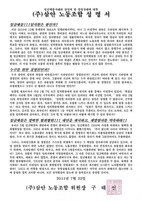 삼안노조 16일차 파업투쟁 진행 작성자 정보 안중언 작성 작성일 2011.07.26 10:33 컨텐츠 정보 3,248 조회 2 댓글 목록 본문 . 관련자료 이전 민주노총 김영훈위원장 희망단식 13일차 현장소식 작성일 2011.07.26 10:38 다음 쌍용건설노조 김성한 위원장 무기한 농성투쟁 돌입 작성일 2011.07.26 10:27 댓글 2 남관우님의 댓글 남관우 작성일 2011.07.26 13:19 끈질기게 물고늘어져 승리를 쟁취하자 !!! 답글 끈질기게 물고늘어져 승리를 쟁취하자 !!! 정의열님의 댓글 정의열 작성일 2011.08.05 10:21 어떤 어려움이 있더라고 반드시 승리할거라 믿습니다. 아자아자 화이팅~~!! 답글 어떤 어려움이 있더라고 반드시 승리할거라 믿습니다. 아자아자 화이팅~~!! Select File Upload File 목록