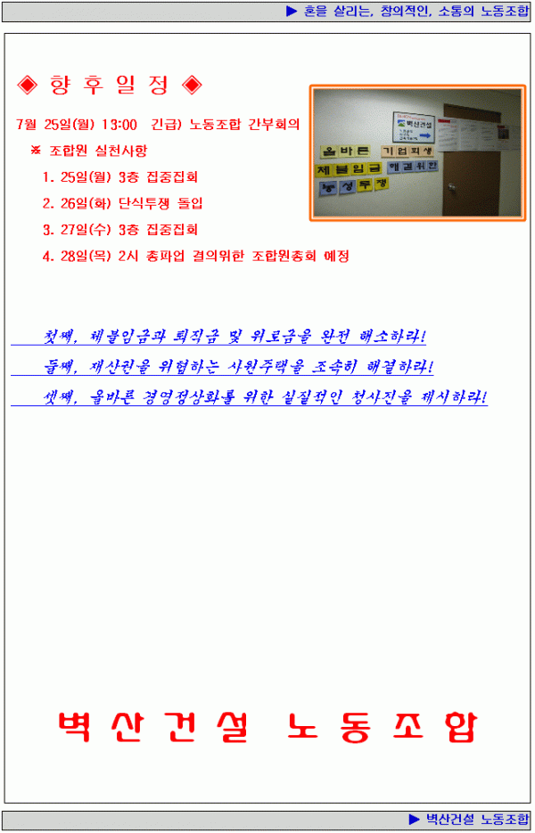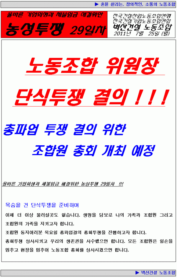 벽산건설노조 박동빈위원장 단식투쟁 돌입 !! 작성자 정보 안중언 작성 작성일 2011.07.26 10:24 컨텐츠 정보 3,270 조회 1 댓글 목록 본문 벽산건설노조 박동빈위원장 단식투쟁 돌입 !! 관련자료 이전 쌍용건설노조 김성한 위원장 무기한 농성투쟁 돌입 작성일 2011.07.26 10:27 다음 건설기업노련 중앙위 개최 작성일 2011.07.14 09:37 댓글 1 남관우님의 댓글 남관우 작성일 2011.07.26 13:21 벽산건설 노동조합은 반드시 승리한다!!! 답글 벽산건설 노동조합은 반드시 승리한다!!! Select File Upload File 목록