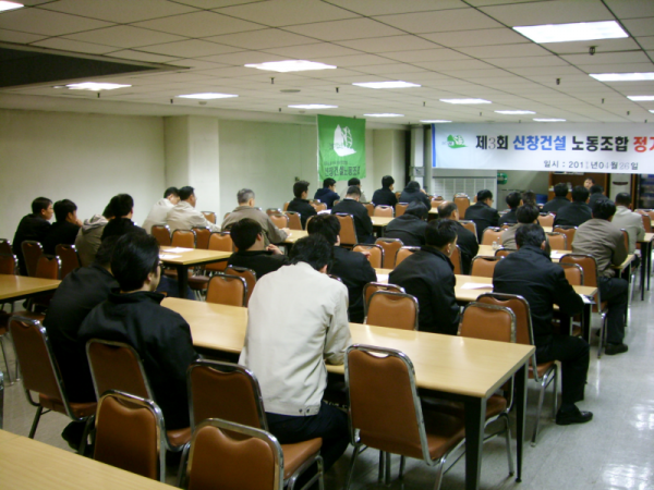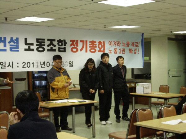 신창건설 노조 위원장 선거 결과 작성자 정보 정책부장 작성 작성일 2011.04.29 14:27 컨텐츠 정보 3,111 조회 1 댓글 목록 본문 신창건설 노동조합 총회 결과를 공지 합니다. 일자: 2011년04월26일 16:00 ~18:10 장소 : 신창건설 본사 지하식당 총원 45명 . 참석인원 34명, 투표참여 33명중 찬성 31, 반대 2 로 남관우 현위원장이 제2대 위원장으로 선출되었습니다. 당선을 축하드립니다. 관련자료 이전 노동절 행사 참가 사진 찾아가세요 작성일 2011.05.02 15:18 다음 한진중공업건설 노동조합 위원장 선거 결과 작성일 2011.04.27 10:00 댓글 1 조관영님의 댓글 조관영 작성일 2011.05.19 10:10 축하 드립니다. 답글 축하 드립니다. Select File Upload File 목록