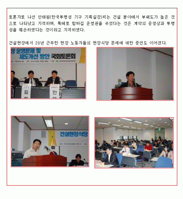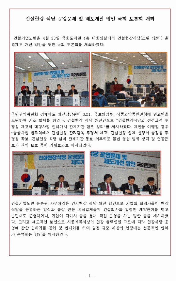 건설현장 식당 운영문제 및 제도개선 방안 국회토론회 개최 작성자 정보 교육홍보 작성 작성일 2011.04.21 10:51 컨텐츠 정보 3,009 조회 목록 본문 건설기업노련 건설현장 식당 운영문제 및 제도개선 방안 국회토론회 관련자료 이전 한진중공업건설 노동조합 위원장 선거 결과 작성일 2011.04.27 10:00 다음 성원건설 법정관리 인가 결정 작성일 2011.04.07 11:25 댓글 0 등록된 댓글이 없습니다. Select File Upload File 목록