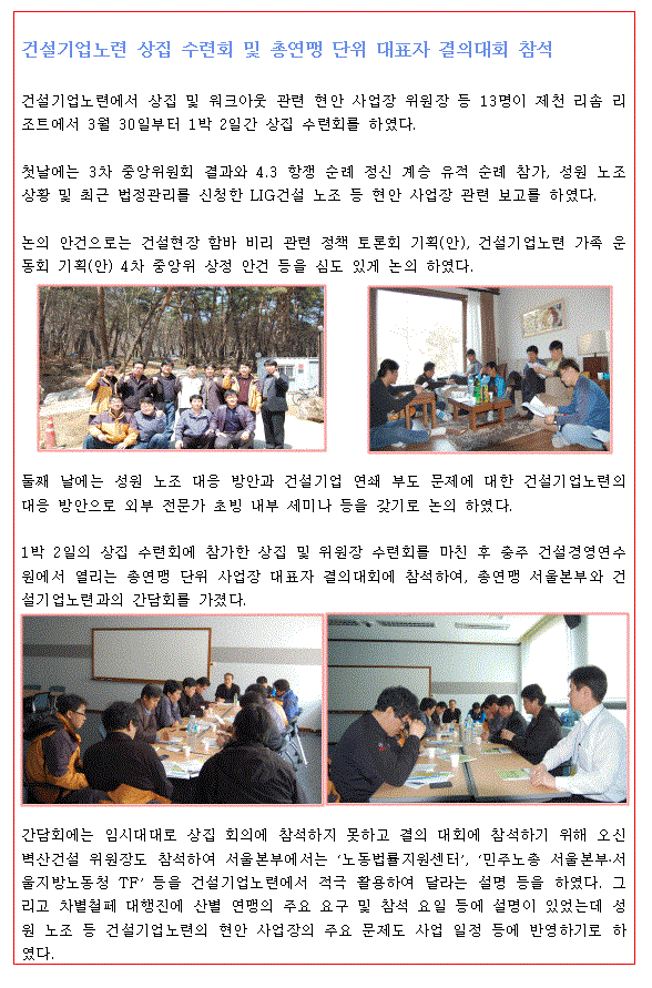 건설기업노련 상집 수련회 및 총연맹 단위 사업장 대표자 결의대회 참가 작성자 정보 교육홍보 작성 작성일 2011.04.01 10:15 컨텐츠 정보 3,032 조회 목록 본문 건설기업노련 상집 수련회 및 총연맹 단위 사업장 대표자 결의대회 참가 관련자료 이전 성원건설 법정관리 인가 결정 작성일 2011.04.07 11:25 다음 LIG건설노동조합 기자화견 관련 경향신문 사설보도 작성일 2011.03.28 11:01 댓글 0 등록된 댓글이 없습니다. Select File Upload File 목록