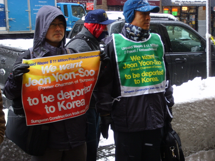 어쨌든 우리는 우리가 할일을 그대로 진행하기로 했습니다. 추방심사가 열리는 건물 앞에서 우리는 1인시위를 진행하고 미국 현지 노동조합 조합원들은 유인물 배포를 진행하기로 했습니다. 시간에 맞추어 현장에 도착한 순간, 조합원 20여명이 순식간에 모여들고 서로 악수를 나누었습니다.