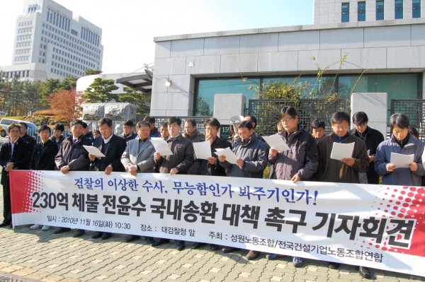 1. 성원건설 전윤수 전 회장(이하 전윤수)은 2010년 3월6일 법정관리 신청 직후 미국으로 도피성 출국을 해버렸습니다. 이에 대하여 검찰은 뒤늦게 구속영장을 청구, 영장을 발부 받았으나 전윤수를 재판정에 세우는데 실패하였습니다. 성원노동조합의 임금체불 진정 당시 123억원이었던 임금체불액은 현재 총 300억원에 이르는 임금, 퇴직금, 각종 보험료 체불로 늘어났습니다.