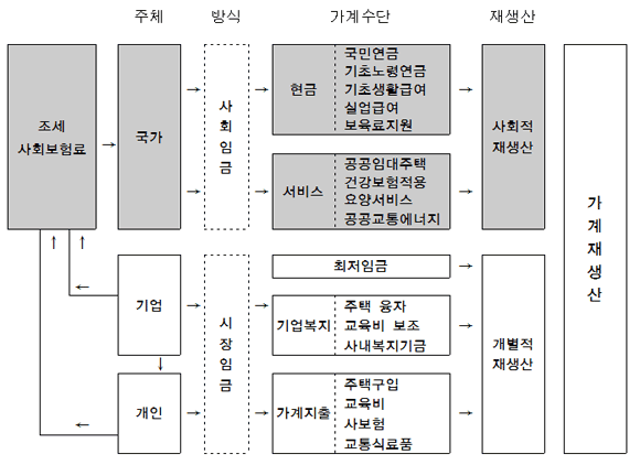 오 실장은 "사회임금이 클수록 일반 가구의 생계가 노동시장의 위험으로부터 완충지대를 가지게 된다"며 "사회임금이 제공하는 실업.의료.주거.보육 등이 인간의 기본적 생활필요를 충족하는 것이므로 경제위기에 따른 구조조정이 이루어질 때 사회적 안전판 역할을 할 수 있기 때문"이라고 말했다.