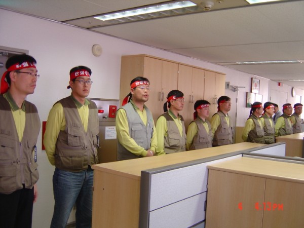 3월27일 철야농성에 돌입한 이래 노조는 매일 출퇴근 선전전을 전개하며 조합원들에게 이번 인사발령의 부당성을 알려내는 한편 오후시간에는 민주노총 김명호 기획실장 등을 초정하여 간부교육을 진행하기도 했다. 그리고 건설사무노조 조합원들의 연대와 지지방문 역시 농성기간 내내 이어지는 등 노조는 △부당 인사발령의 철회 및 대상자 원직복직 △단체협약에 위반한 일방적인 대기발령 금지 △개인면담을 통한 퇴직강요 행위 금지 등을 요구하며 끈질기게 투쟁을 이어왔다.